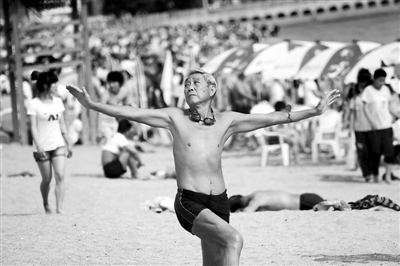 6月17日,游人在青岛第一海水浴场消暑休闲。