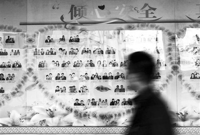 冀中能源邯东矿矿井口,一面由矿工家属全家福组成的照片墙提醒每天下井的矿工注意安全。杨登峰 摄