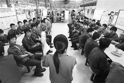 上海一家汽车企业在交班前组织员工上安全课。杨登峰 摄