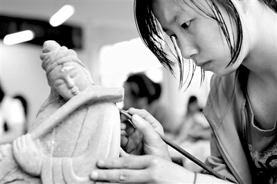 6月18日,重庆市大足职业教育中心,民间工艺美术专业的学生正在学习制作大足石雕工艺品。据悉,重庆市大足职业教育中心今年3个地方特色专业的493名职高毕业生全部实现就业,就业率达100%,且供不应求。重庆市大足职业教育中心大力发展地方特色职教,分别开设民间工艺美术、数控技术应用和旅游专业3个地方特色专业,培养优秀的地方特色产业人才。 罗国家 摄