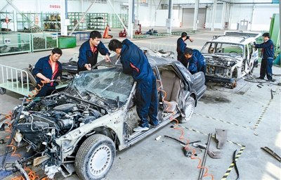 在天津市国联报废机动车回收拆解有限责任公司,工作人员在拆解报废汽车(6月19日摄)。天津市近年来大力发展循环经济再生资源回收利用,在报废机动车回收拆解上,将子牙循环经济产业区原7家相关企业整合为一家综合性大规模的报废机动车回收拆解企业。目前,企业年回收拆解报废机动车1.5万辆,加工生产铜、铁、铝及塑料产品2.5万吨,通过对报废汽车废旧零部件的再制造再利用,不仅可以减少社会环境负担,还能节约资源,实现循环经济,使报废汽车100%转化为有色金属及其它材料。 新华社发(张超群 摄)