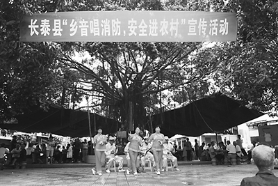 福建长泰县消防大队邀请社区腰鼓队在县城中心地带演出。他们将消防安全知识编成顺口溜,以腰鼓、舞蹈、演唱、评书、快板等形式传播给群众。苗苗 摄
