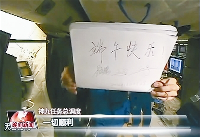 “端午快乐”——当景海鹏将写有这四个大字的飞行手册对准天宫一号舱载摄像机时,北京飞控中心内掌声一片。