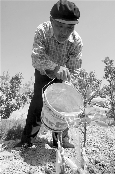在“苦甲天下”的甘肃省定西市,一个年逾古稀的老人靠着一把镢头一把揪,一间土房一只狗,打埂筑坝、义务植树30多年、造林30余万棵,仅凭一己之力,硬是将原来寸草不生的400多亩荒山变成一片绿山。这个可敬的老人就是现年72岁的王永瑞。图为王永瑞为新栽的小树苗浇水(6月22日摄)。新华社记者 郭刚 摄