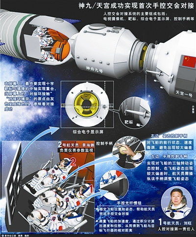 这一操作是由在地面进行了1500多次模拟训练的43岁航天员刘旺实施的。12时38分,他开始手动控制飞船的姿态、速度和方向,使神舟九号从140米外向天宫一号缓缓接近。