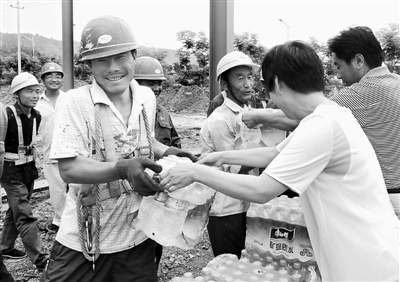 近日,陕西省宝鸡市总工会干部带着白糖、茶叶、啤酒、矿泉水等防暑降温用品,来到金河工业园慰问建设者,向奋战在高温建设一线的职工送去了清凉。据悉,今年该市将向30多个重点项目建设工地开展“送清凉”活动,为工人送去价值10多万元的防暑降温用品。谢红江 摄