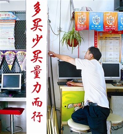 彩民在上海浦东新区一家彩票店内研究彩票走势图,店内挂着“多买少买量力而行”的标语。(6月16日摄)