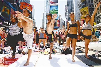 6月20日,为了迎接一年中最长的一天——夏至的到来,大约1.4万人来到美国纽约时报广场,参加名为“喧嚣之上的心灵”的集体练瑜伽活动。今年是美国纽约时报广场第十次举行集体练瑜伽活动。肖劼 供图