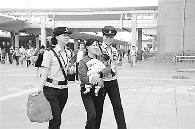 在“服务旅客创先争优”活动中,大同火车站派出所从满足旅客对铁路服务工作的需求入手,努力提供安全优质的服务。图为民警帮助旅客出站。杨立强 摄