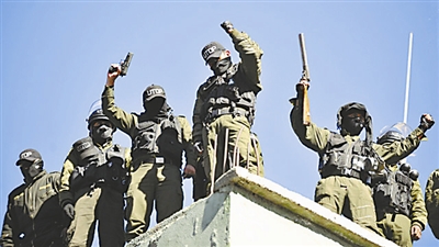 上图为示威警察站在位于拉巴斯的警察总部屋顶。(阿康供图)
