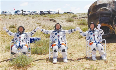 6月29日,航天员景海鹏、刘旺、刘洋出舱后致意。 新华社记者 王建民 摄