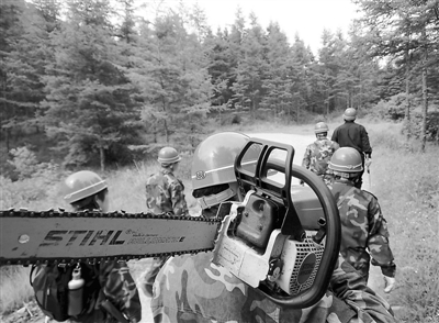 职工们扛着油锯(打枝机)穿行在林间,他们早出晚归,保护着受过伤害的森林。