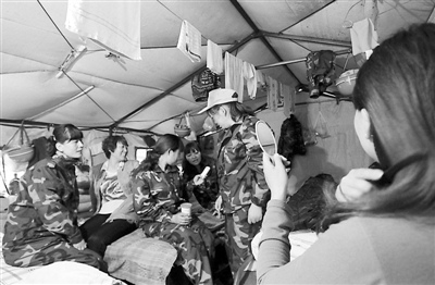 下班后,女职工聚在一起聊天,分享家人发来的问候短信。