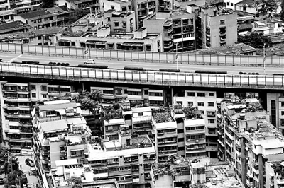 贵阳水口寺大桥是贵阳市区通往贵阳龙洞堡机场的交通要道之一,已有多年历史,但大桥下高达八九层的楼层几乎贴近桥板。这些住在大桥下的居民无论是白天或是晚上,都有滚滚车轮从头上跑过,噪音让人难以忍受。王平平 摄