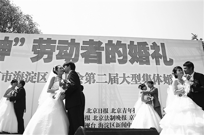 2012年5月26日,北京海淀区总工会在海淀公园中心草坪举行职工集体婚礼,18对新人从此开始新生活。王海欣 摄