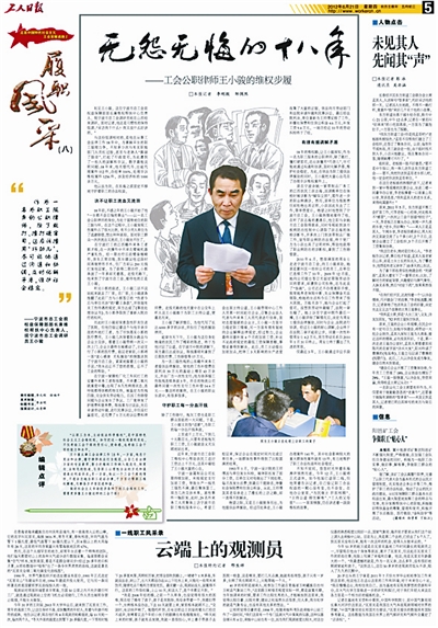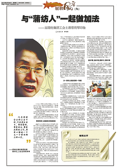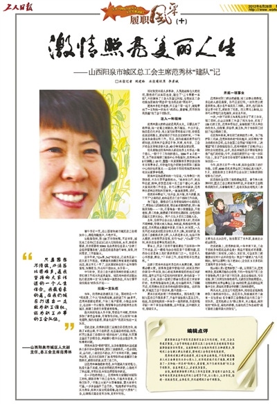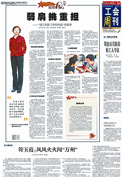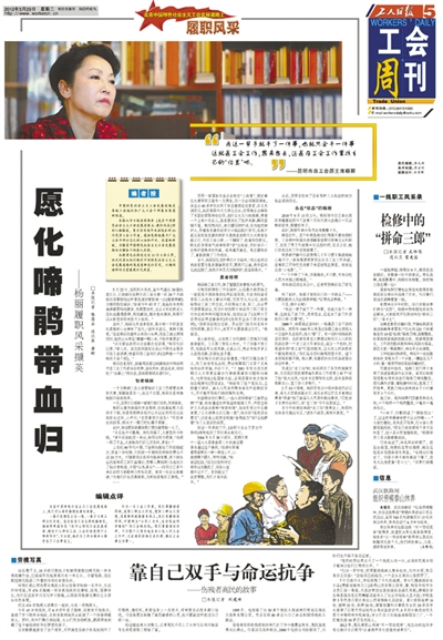 本报从5月29日起连续推出的《走在中国特色社会主义工会发展道路上·履职风采》栏目,重点宣传了近年来涌现出的杨丽等10位优秀工会工作者。他们在中国特色社会主义工会发展道路上,努力工作、执著进取、积极探索、甘于奉献,用自己的心血和汗水,谱写了一曲曲感人的当代工会之歌。他们为广大工会工作者树立了学习的榜样,为努力践行中国特色社会主义工会发展道路带来了力量。