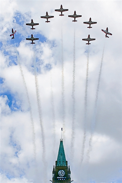 7月1日,在加拿大首都渥太华,加拿大空军“雪鸟”飞行表演队从国会大厦和平塔上空飞过。当日,加拿大在渥太华举行仪式,庆祝建国145周年。新华社发(戴维·河合摄)