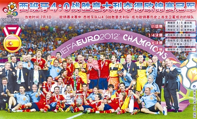 西班牙4:0战胜意大利夺得欧锦赛冠军。 新华社记者 卢哲 编制