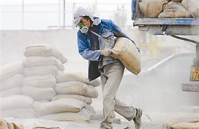 2011年10月27日,南京一处建筑工地里搬运水泥建材的农民工。 安心 摄