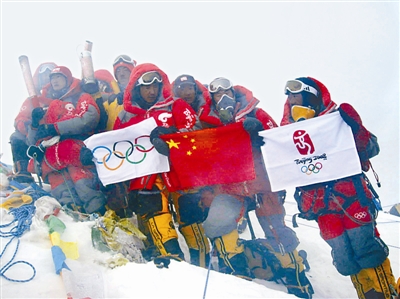 2008年5月8日9时17分,北京奥运会火炬登上了世界最高峰珠穆朗玛峰峰顶,实现了奥运火炬登上地球之巅的人类梦想,是奥运史上一次空前壮举。图为登山队员在峰顶展示中国国旗、奥运五环旗和北京奥运会会徽旗。新华社发