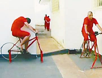 图为该监狱中的囚犯在骑自行车。