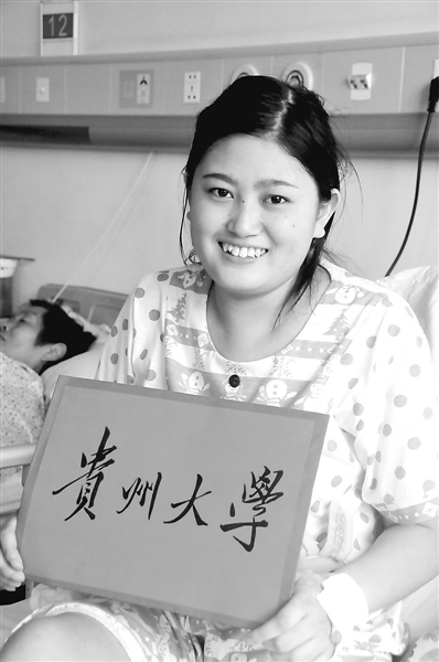 7月7日,贵州大学相关负责人在遵义医学院附属医院看望肖丽时,表态拟录取“最坚强高考女孩”肖丽。今年高考,贵州省湄潭县农家女孩肖丽在已身患癌症,左腿高位截肢的情况下,坚持走进“一个人的考场”,并考出文科544分、超出贵州省一本录取分数线的好成绩。肖丽的感人事迹被媒体报道后感动了网友,被称为“最坚强高考女孩”。 新华社记者 闫起磊 摄