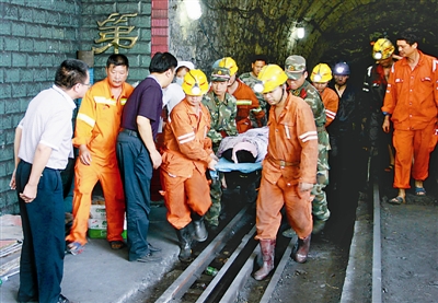 7月8日,湖南省耒阳市三都镇,救援人员正在救助被困矿工。7月7日晚9点,湖南耒阳茄莉冲煤矿透水事故救援工作取得重大进展,救援人员用60个小时打通巷道,并已经确认了4日被困井下11名矿工的下落。