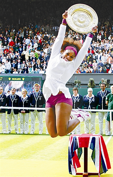 7月7日,美国选手小威廉姆斯在温网女单颁奖仪式上庆祝夺冠。