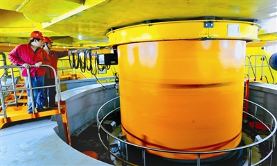 这是技术人员在查看三峡地下电站最后一台机组转轮的运行情况(2012年5月21日摄)。