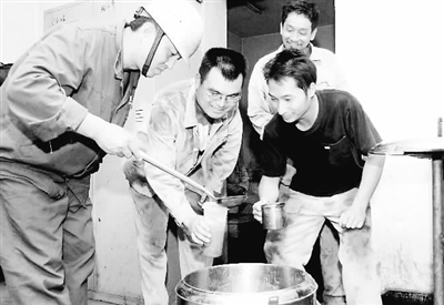 “要进度更要安全,突击也要错开高温时段。”这是7月6日早上6时30分,新钢集团9号高炉炉前常日班在班前会上着重强调的一句话。 在前一天接到突击清理沉淀池水渣任务后,为避开中午酷热天气,他们一大早就来到了班里,开完班前会后就到场地上开始干活。为做到劳逸结合,他们分成两组轮换作业,每组持续时间不得超过20分钟。上午11时不到,整个清渣任务就完成2/3,他们也早早就回到休息室,等到下午3点钟以后再把剩下的清理完。图为在休息室盛绿豆汤情形。李健勇 陈欣 摄