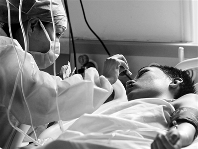 7月15日,在河北省秦皇岛市第二医院重症监护室内,李博亚的母亲尹莉正在照料他。