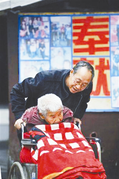 杨美学推着助养院里的孤残老人散步 。