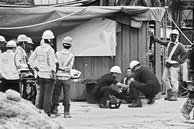 7月18日,在新加坡一处地铁工地上,救援人员为一名工人检查。新加坡人力部18日说,一处地铁工地的脚手架当天上午突然坍塌,两名中国工人被埋在水泥堆中不幸死亡。另有8名外来工人受伤。 新华社发(邓智炜 摄)