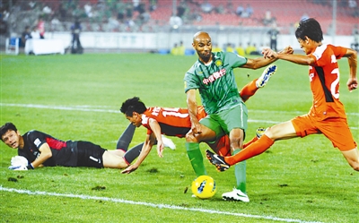 7月18日晚,2012赛季中国足协杯1/8单场淘汰赛全面展开,北京国安主场对阵青岛中能。最终国安6∶0大胜中能,晋级足协杯八强。 本报记者 许之丰 摄
