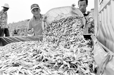7月20日,江西鄱阳县的渔民将打捞上的鱼倒入运输车中。