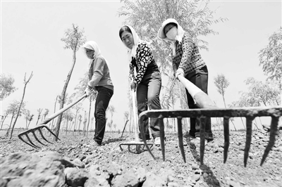 7月19日,在宁夏回族自治区中宁县黄河岸边,几位负责黄河沿岸绿化的工作人员在翻土植树。