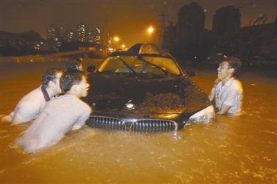 7月21日傍晚,北京立水桥,几位路过的行人帮助一位司机将被水淹的汽车移动到高处。本报记者 杨登峰摄