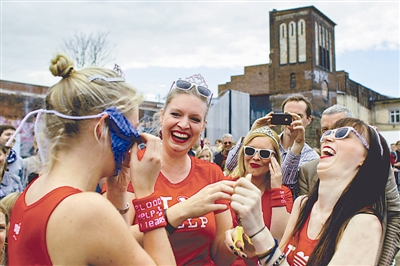 当地时间7月21日,柏林举行了民间趣味奥运会,扔眼镜、跳布袋、面部搞怪等比赛妙趣横生。图为面部搞怪比赛中参赛者们看着一名队友的造型哈哈大笑。 阿健 供图
