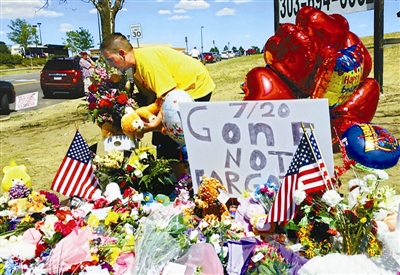 当地时间7月21日,奥罗拉市民卡罗拉斯将自己带来的鲜花和小熊玩具摆放到悼念枪击案遇难者的草坪上。当地居民在影院外点然蜡烛,摆放鲜花、毛绒玩具、气球和各种亲情卡片,为遇难者祈祷祝福。 王欢 供图