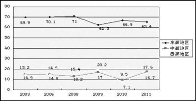 2003-2011年农民工就业的区域流动变化(%)(数据来源:据国家统计局农民工监测报告计算)