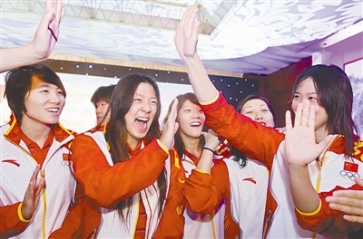7月23日,中国女子水球队运动员宋冬伦(左二)、马欢欢(右一)和队友击掌。当日,天津市体育局为在天津进行集训的中国女子水球队送行。中国女子水球队13名运动员将于24日奔赴伦敦参加奥运会。