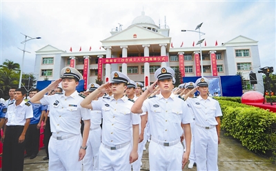 7月24日,海军官兵在三沙市成立大会暨揭牌仪式升旗仪式上敬礼。