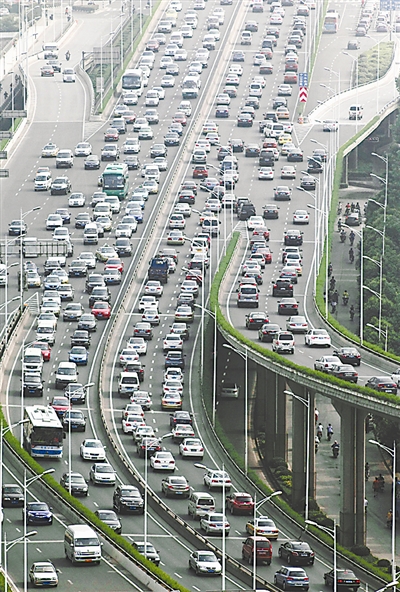 中国公安部日前发布的信息显示,截至2012年6月底,中国机动车总保有量达2.33亿辆,其中汽车1.14亿辆,摩托车1.03亿辆。图为7月19日,江苏南京城东干道高架桥上,大批车辆缓慢行驶。