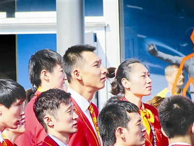 “准旗手”阿联(中)和队友一起向国旗行注目礼。本报特派记者 宋澎 摄