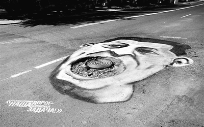 7月23日在俄罗斯叶卡捷琳堡,斯维尔德洛夫斯克州州长的涂鸦像被画在存在坑洼的道路上,道路坑洼正在其嘴部。左边的文字写到:“道路重建是我们的优先处理事宜。”谢涛 供图