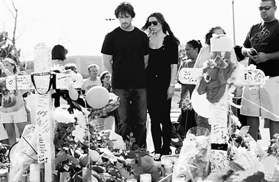 7月24日,在美国科罗拉多州奥罗拉市,美国演员、“蝙蝠侠”的扮演者克里斯蒂安·贝尔造访影院枪击案遇难者悼念现场,向亡者敬献鲜花。吉平 供图