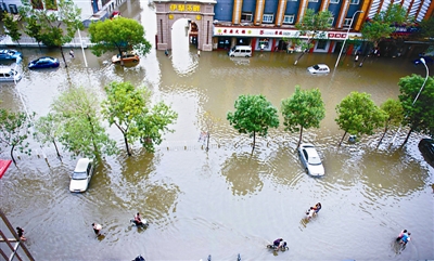 7月26日,天津市成林道被大雨过后的积水淹没。