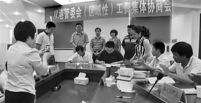 柯城双港开发区有272家企业,6518名职工。企业多,规模小,个别企业用工制度、社会保险制度不健全。在区总工会的支持下,开发区管委会决定开展区域性工资集体协商,构建和谐劳动关系。当日,企业方与职工方就最低工资标准、加班工资、工资增幅等进行协商并达成一致意见,双方代表在合同上郑重签字。毛朝阳 何康乐 摄