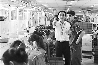 7月25日,卢银辉(右二)在车间内与一名班组长交流。