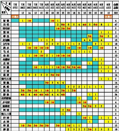 注:表中均为伦敦时间;蓝色为比赛日;黄色为决赛日及产生金牌数;红星为中国队冲金点。 制表:郎成